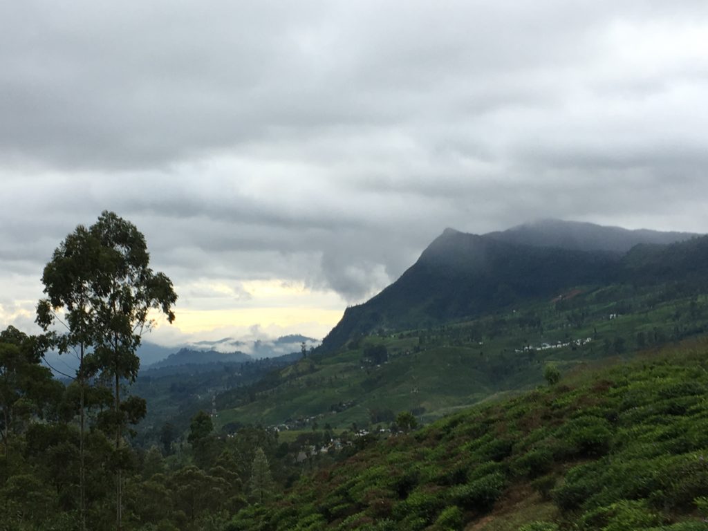 First, a word about Nuwara Eliya- it is a small city in the center of the country of Sri Lanka. as the crow flies, 175 km (108 miles) from the capital city of Colombo, but a very lengthy car ride- about 5 hours- due to the terrain. The city of Nuwara Eliya is in the mountainous region of Sri Lanka. In fact, the city is in the shadow of Mount Pidurutalagala, the tallest mountain in Sri Lanka. The cool, wet climate in this region makes it ideal for growing tea, and so the hills are covered with tea trees belonging to numerous tea companies hosting “plantations.” (I learned yesterday that tea grows on trees, not shrubs, but the trees are constantly pruned and trimmed to a manageable 3 ft tall for the purposes of easier picking.)